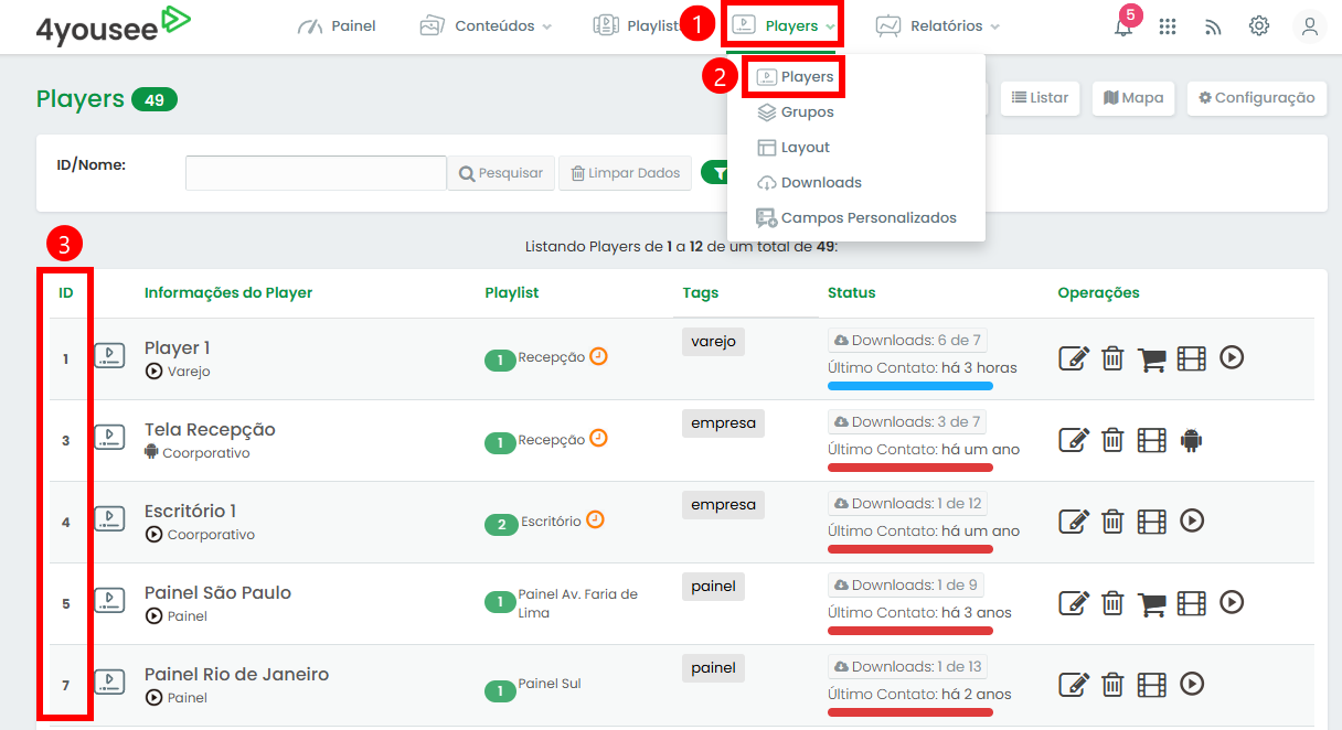 Para saber qual o "ID do Player", acesse o Manager e clique no menu: Players (1) > Players (2). O ID é informado no canto esquerda tela (3).