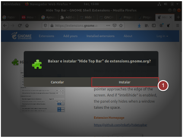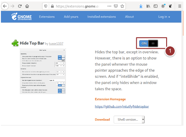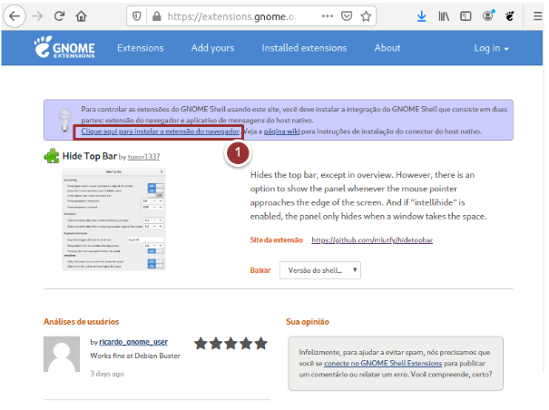 - Abra o navegador e acesse a página da extensão: Hide Top Bar — GNOME Extensions.