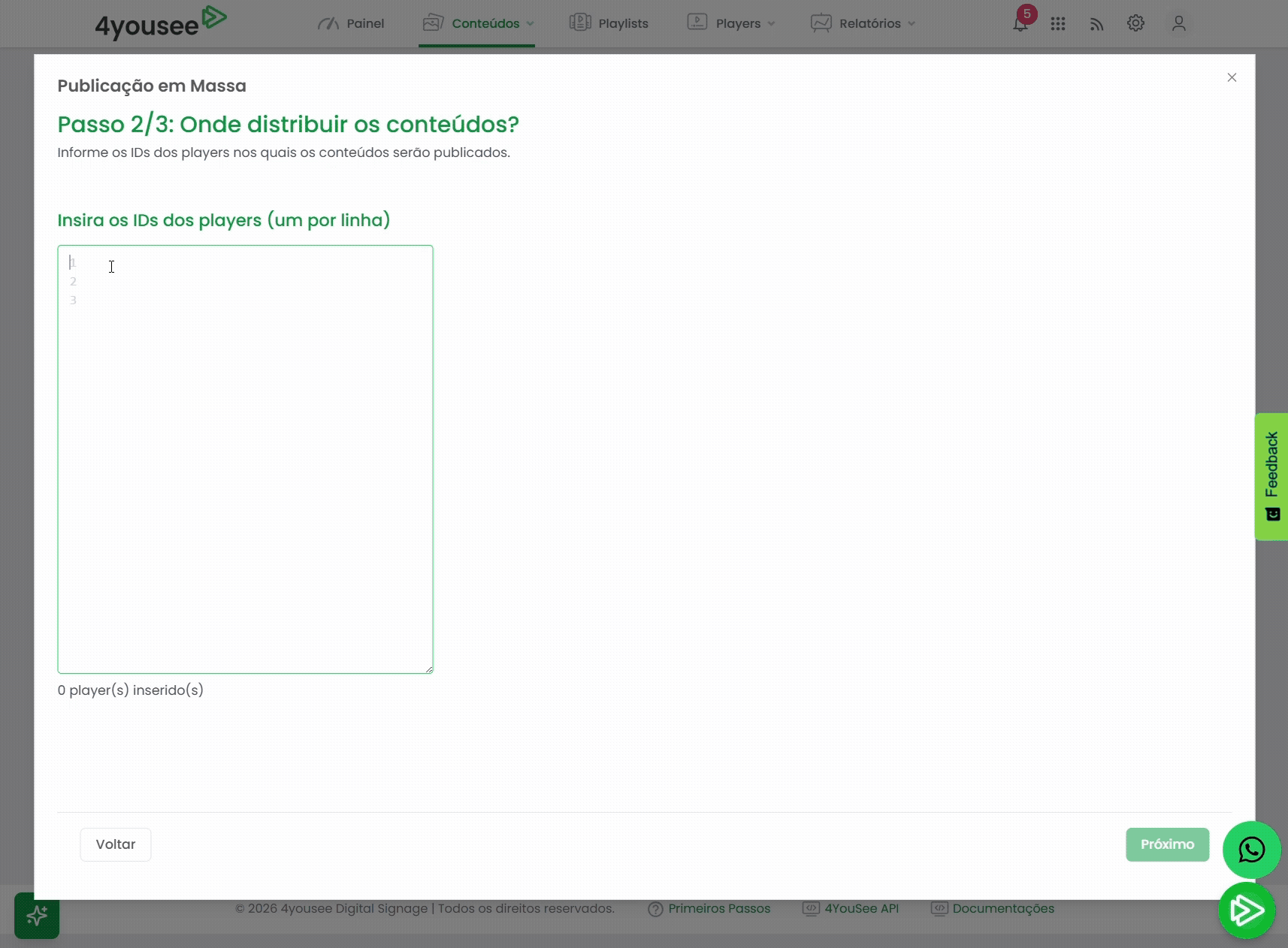 - Playlists Compartilhadas: Se múltiplos players utilizam a mesma playlist, o conteúdo publicado ficará visível em todos eles. Para evitar isso, utilize playlists exclusivas por player.