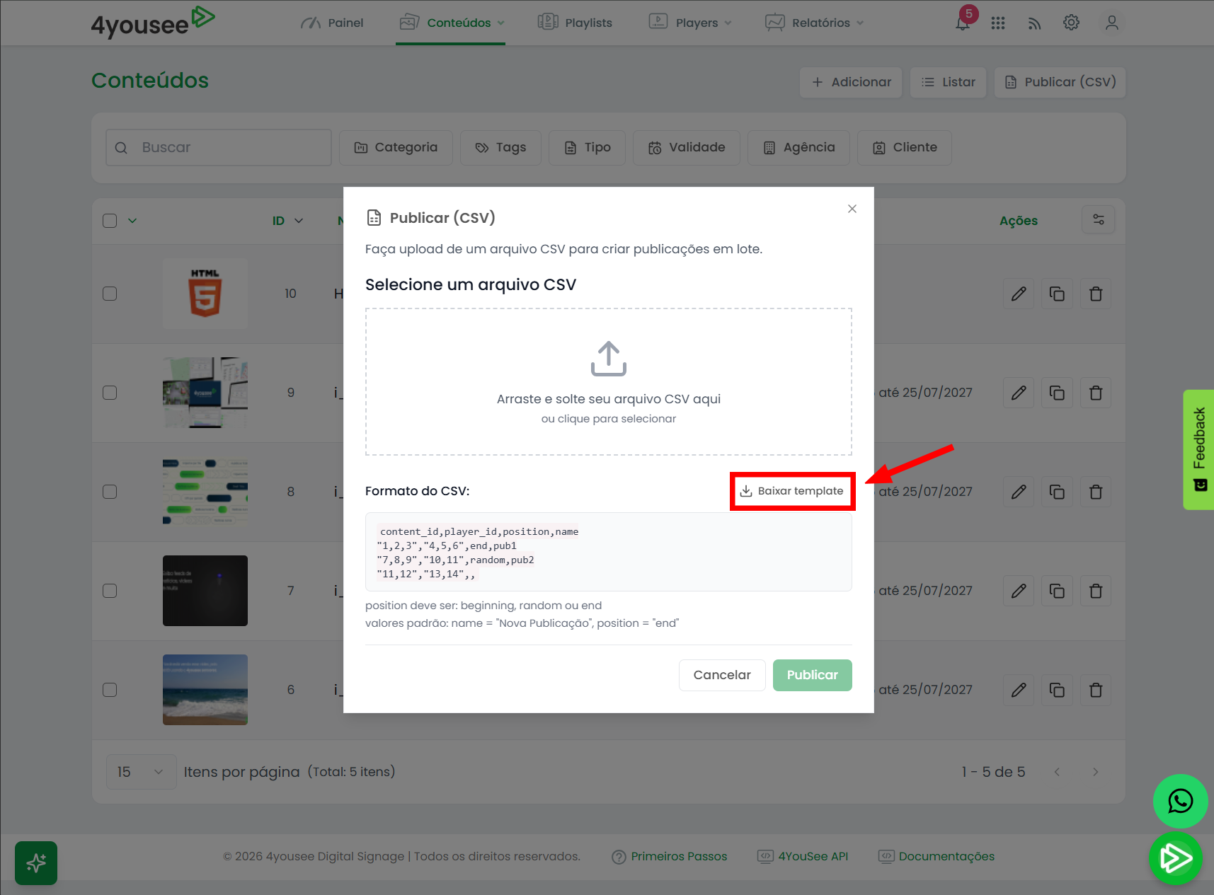 Recomendada para operações em larga escala e mais avançadas, onde é necessário publicar múltiplos conteúdos para múltiplos players de forma automatizada. Utiliza um arquivo CSV para definir conteúdos, players, posição na playlist e nome da publicação, garantindo eficiência e rastreabilidade.